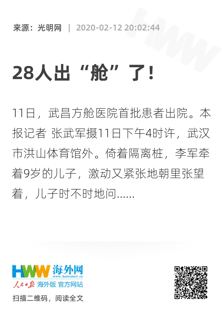 同张凤玲一起出院的,还有27位病友。他们中,最早入院的是2月6日,最晚的是2月9日,年龄最小的25岁,最大的69岁。“武汉加油!中国加油!感谢医护人员,感谢国家!”一出院,张凤玲带头喊起了口号,这是酝酿在她心中多日的话。