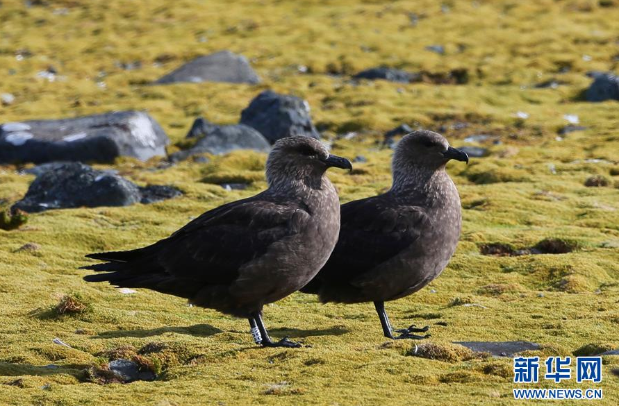 长城站贼鸥湖边苔藓地上的两只贼鸥(2月9日摄)。新华社记者 刘诗平 摄