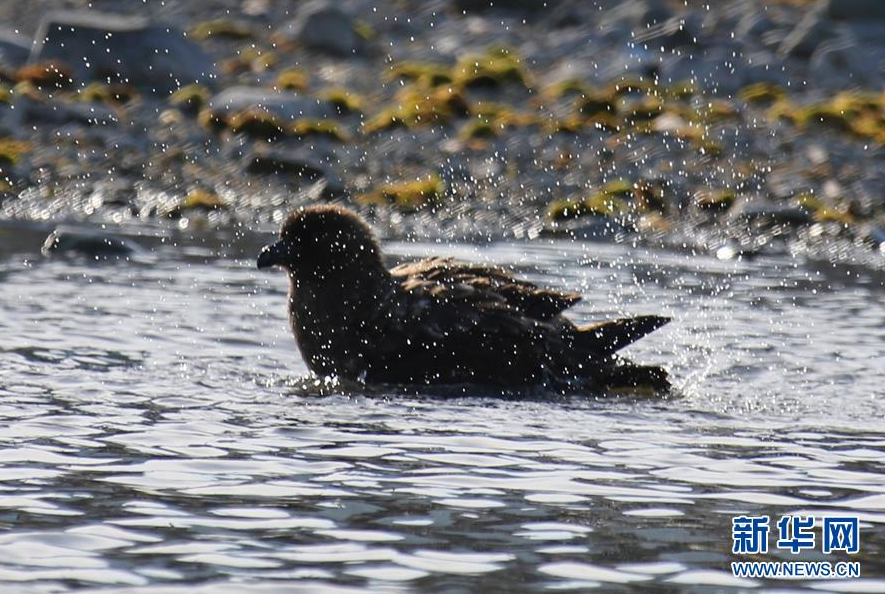 长城站贼鸥湖里戏水的贼鸥(2月10日摄)。近日,“雪龙2”号极地科考破冰船停泊在南极长城站附近海域卸货。卸货期间,记者在长城站采访,看到这里的科考队员保护环境,人与自然和谐相处。长城站是中国第一个南极科学考察站,1985年2月建成,位于南极洲南设得兰群岛的乔治王岛上。站区里生活着一群怡然自得的贼鸥,它们的家——贼鸥湖,与长城站科考队员的生活区相邻,相距不足60米远,两者之间是一片难得的黄绿色苔藓地相连。在贼鸥湖边及长城站附近的海边,不时有一只或一群企鹅光顾。它们或游走于其间,或卧眠于一处,与科考队员和平相处,宛如一家。新华社记者 刘诗平 摄