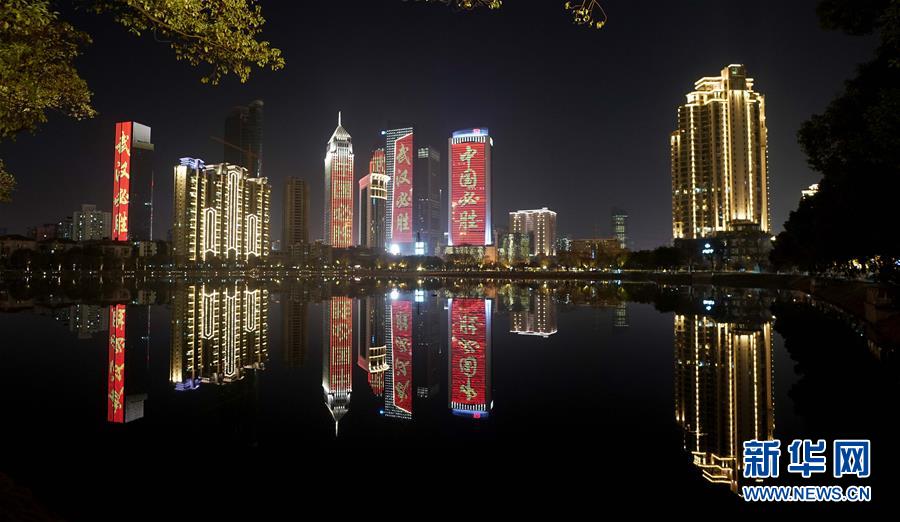 2月12日晚,武汉市江汉区西北湖附近的高层建筑上打出“武汉必胜”等标语。 新华社记者 王毓国 摄