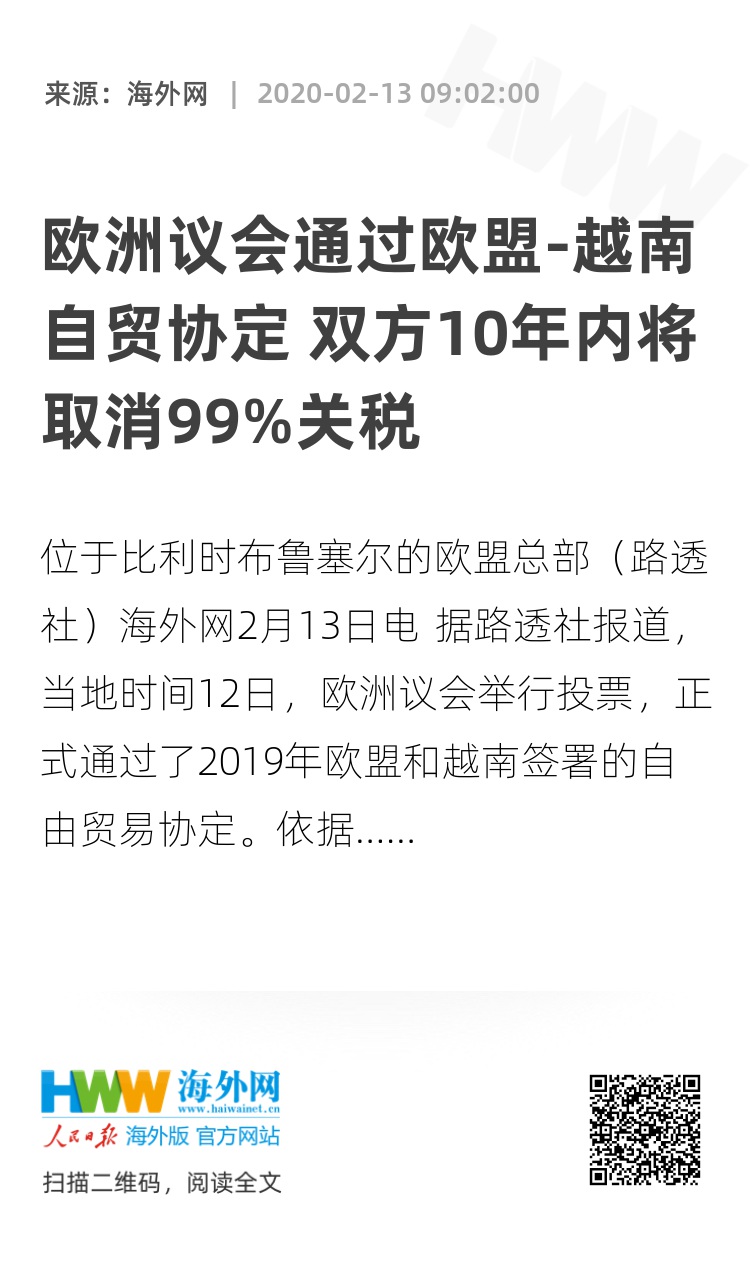海外网2月13日电 据路透社报道,当地时间12日,欧洲议会举行投票,正式通过了2019年欧盟和越南签署的自由贸易协定。依据协定,双方将在10年内逐步取消99%的关税。
