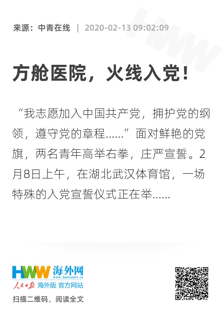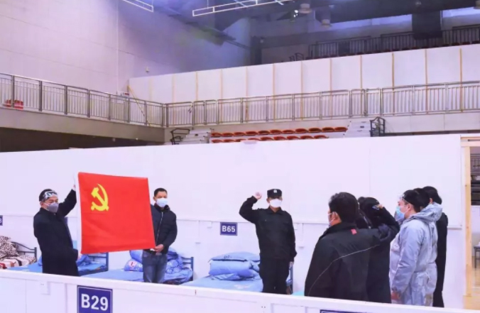 仪式之所以特殊,是因为入党人是湖北省武汉市硚口区检察院两名青年干警贺智恒、龙飞,而入党地址,则是在抗击新型冠状病毒感染的肺炎疫情一线——武汉体育馆方舱医院。