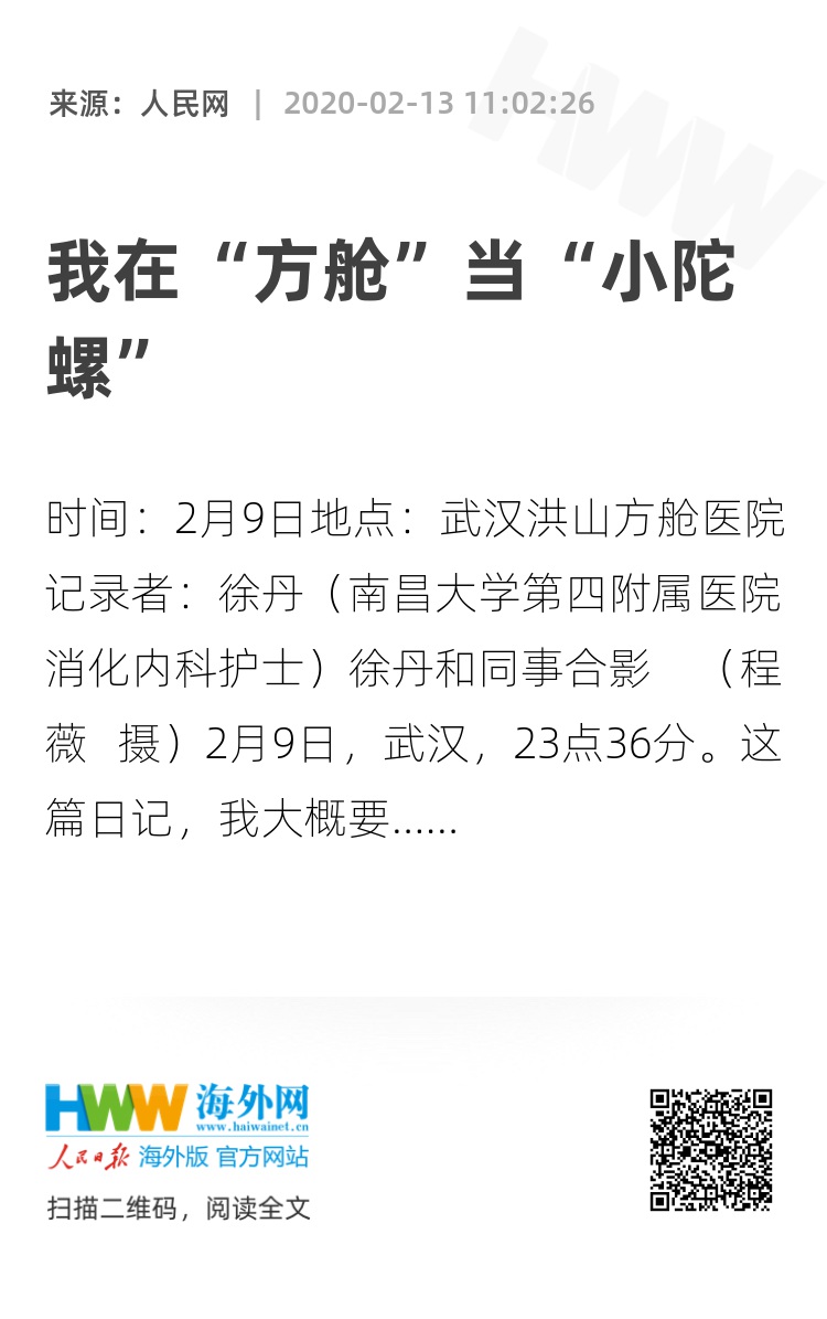 在武汉的这些天,一直能感受到来自“后方”的温暖,医院每天都会关心我们,领导会给我们的家人打电话,告知他们我们的工作状况,让家人们安心。每天都会收到来自家人、同事、朋友们的关心,问我们是不是还好,有没有碰到什么困难,真的觉得非常温暖。