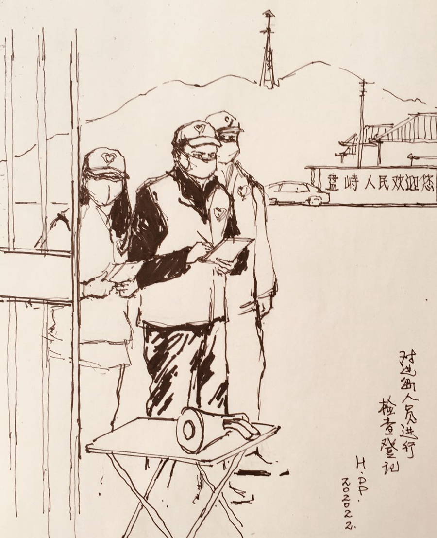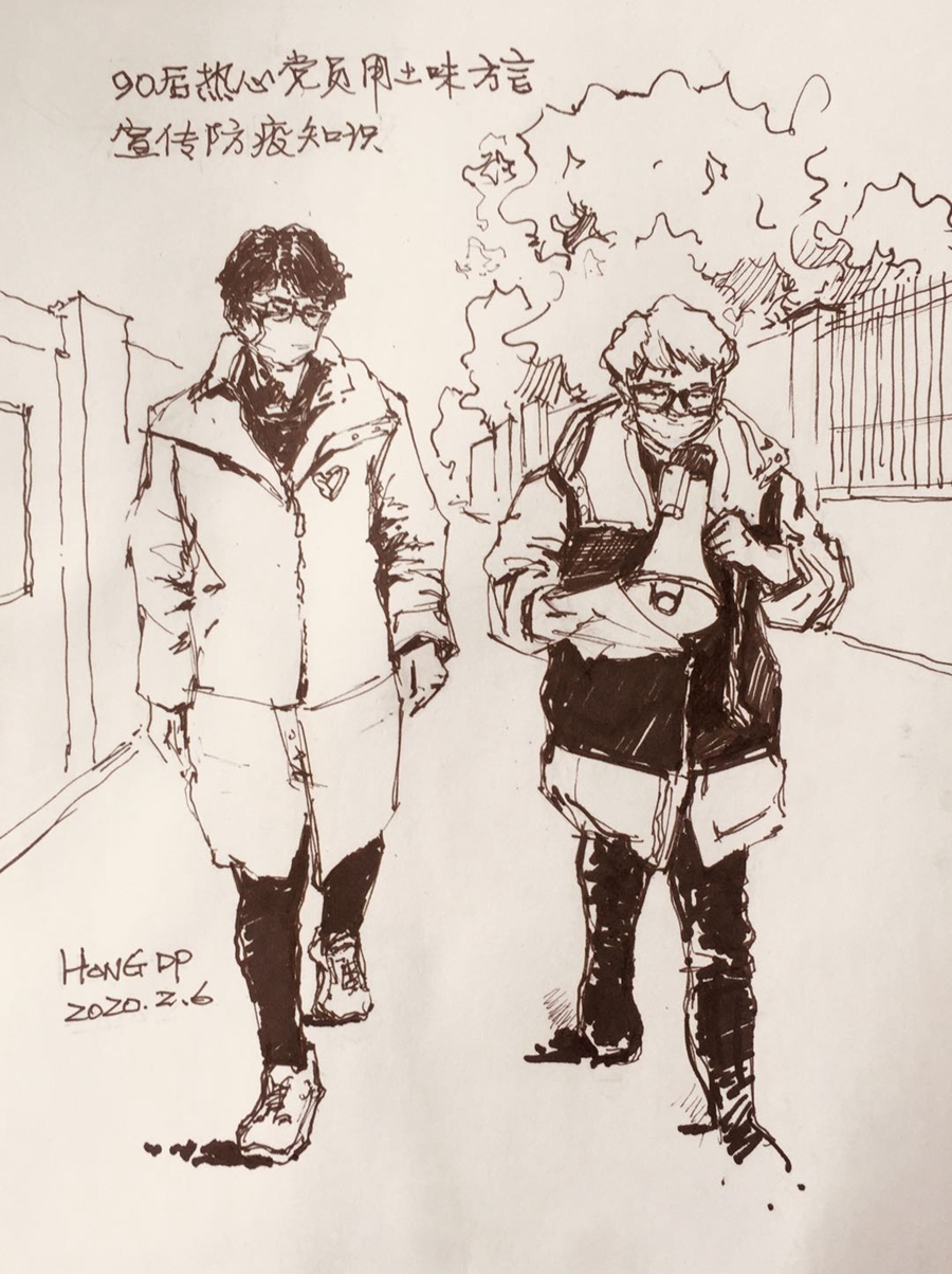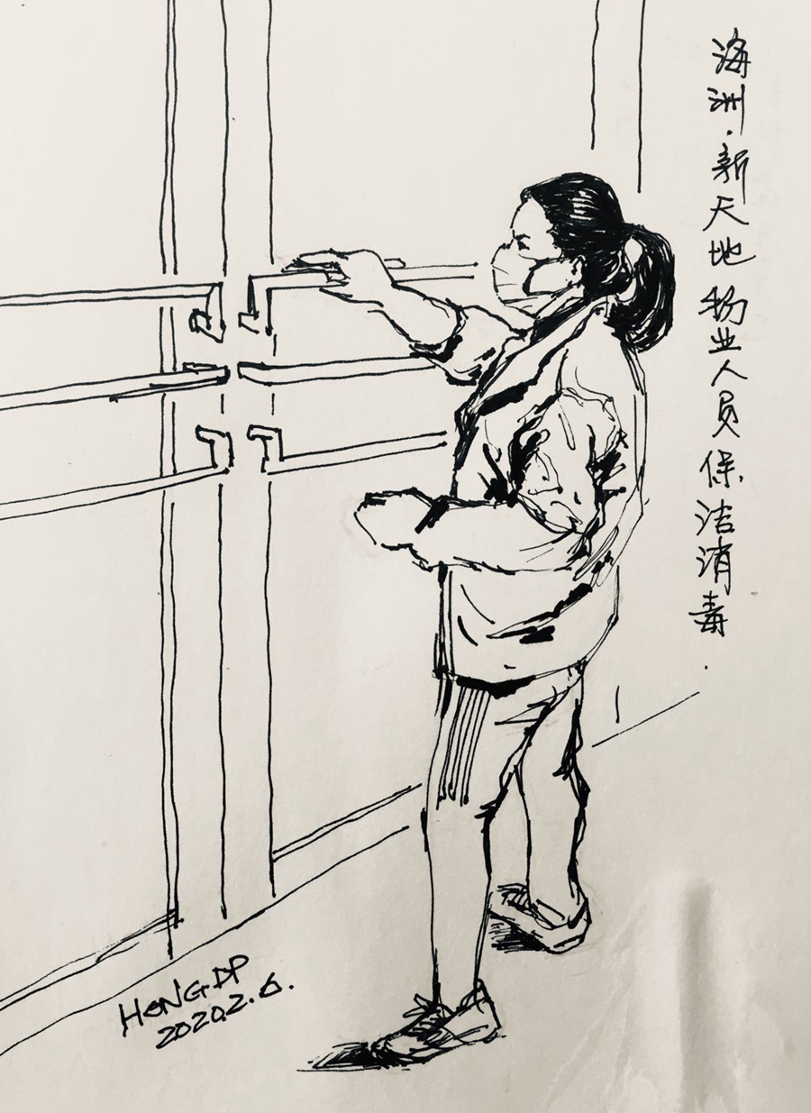 抗击疫情以来,人员排摸、体温检测、杀菌消毒等工作场景大家早已司空见惯,这些熟悉的场景被定海区退休职工洪道平用速写的方式记录下来以后,却带给人们别样的感动。洪道平说:“我们可以用多种途径来声援、来驰援这个抗疫斗争,作为手绘,我们也可以表现一下他们基层一线工作人员一些辛勤的付出。”