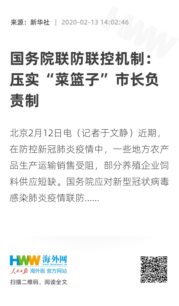 新华社北京2月12日电(记者于文静)近期,在防控新冠肺炎疫情中,一些地方农产品生产运输销售受阻,部分养殖企业饲料供应短缺。国务院应对新型冠状病毒感染肺炎疫情联防联控机制12日发布通知,要求压实“菜篮子”市长负责制,做好农产品稳产保供工作。