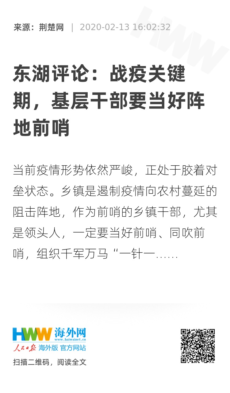 当前疫情形势依然严峻,正处于胶着对垒状态。乡镇是遏制疫情向农村蔓延的阻击阵地,作为前哨的乡镇干部,尤其是领头人,一定要当好前哨、同吹前哨,组织千军万马 “一针一线”织起基层疫情防控阻击网,确保农村阵地稳如磐石。