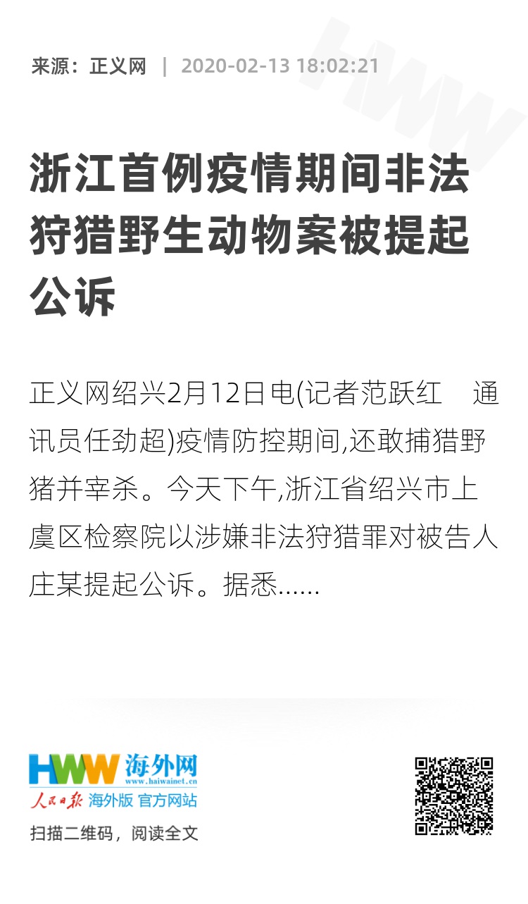 正义网绍兴2月12日电(记者范跃红 通讯员任劲超)疫情防控期间,还敢捕猎野猪并宰杀。今天下午,浙江省绍兴市上虞区检察院以涉嫌非法狩猎罪对被告人庄某提起公诉。据悉,该案系浙江省首例在疫情防控期间被依法提起公诉的非法狩猎野生动物案。