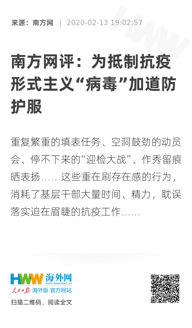 尽管当前新冠肺炎疫情形势仍然严峻,尽管在疫情防控工作中中央一再强调坚决反对形式主义、官僚主义,让基层干部把更多精力投入到疫情防控第一线,但是一些地方一些部门,依然囿于固有思维,观念陈旧、积习难改,形式大于内容,过场重于结果,表面看似热烈,实则空空洞洞,把分秒必争的宝贵时间,把基层干部的有限精力,空耗在一些无用功上。