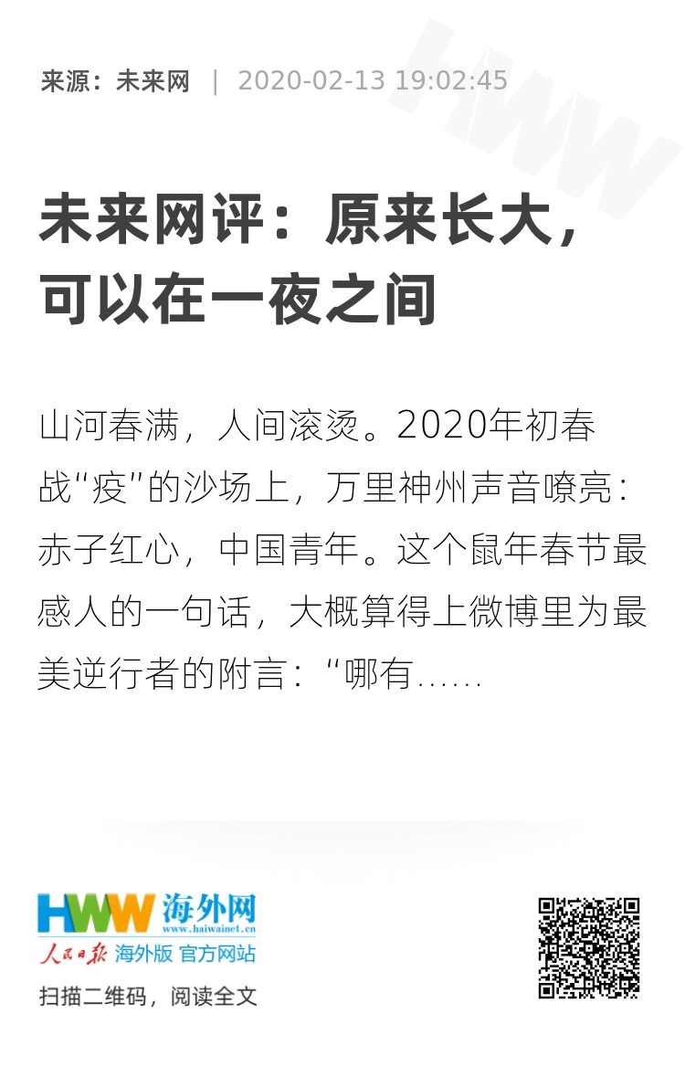 和时间赛跑,与病毒鏖战。在前线,他们是白衣天使;在后方,他们是主力担当。急诊室里、ICU病房间、火神山医院和雷神山医院的建设工地上,还有长途运输的供给线上、社区管理的工作者中、筹措物资的志愿团队里,这些“学着大人模样”的孩子不惧不退,冲锋在前、担当在肩。他们在微博和朋友圈里,以天南海北的方言表达着同样热血的话语——“面对疫情,我们年轻人不上,谁上?”是的,我们不会赞美任何一场灾难,但灾难中呈现的光与热,是最温暖的“人间值得”、是最具体的“家国梦想”。仿佛就在昨天,他们,还是我们眼里的“祖国花朵”,却在突如其来的疫情面前,战成护佑人民生命健康的最硬的防护墙。