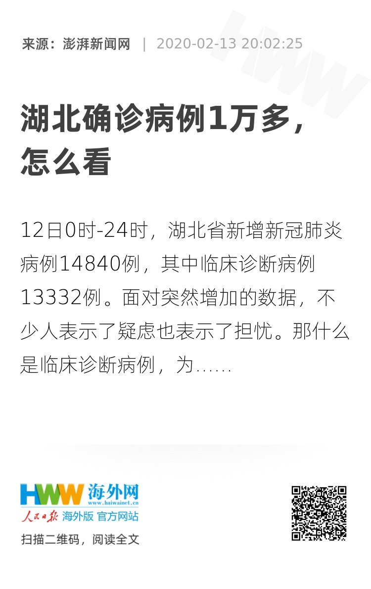 12日0时-24时,湖北省新增新冠肺炎病例14840例,其中临床诊断病例13332例。面对突然增加的数据,不少人表示了疑虑也表示了担忧。