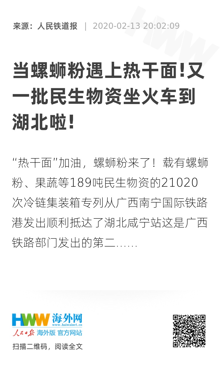 作为广西特色美食,这30000盒螺蛳粉与其他物资“搭乘”专列到达湖北咸宁后,将转运至洪湖市,为疫情中的“热干面”送上壮乡人民的关怀。