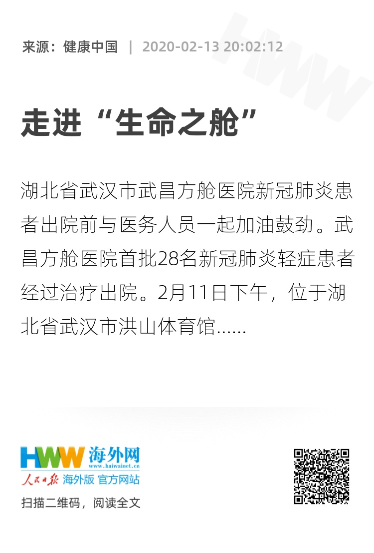 2月11日下午,位于湖北省武汉市洪山体育馆的武昌方舱医院,28名患者集体出院,年龄最小的25岁,最大的69岁,主要年龄段在60岁左右。加上上午江汉方舱医院的6名出院患者,当天两家医院共有34名新冠肺炎轻症患者走出方舱。