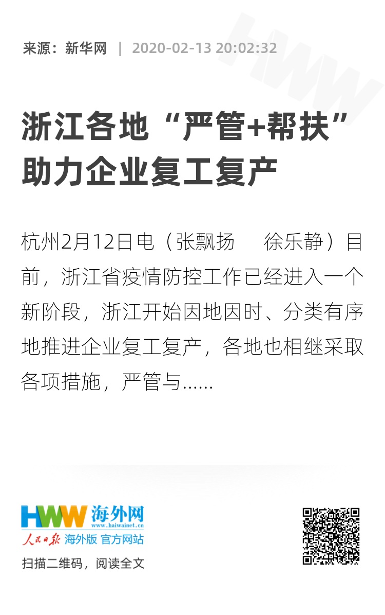 新华网杭州2月12日电(张飘扬 徐乐静)目前,浙江省疫情防控工作已经进入一个新阶段,浙江开始因地因时、分类有序地推进企业复工复产,各地也相继采取各项措施,严管与帮扶并举,助力企业平稳复工、安全生产,真正落实“一手抓疫情防控,一手抓复工复产”。