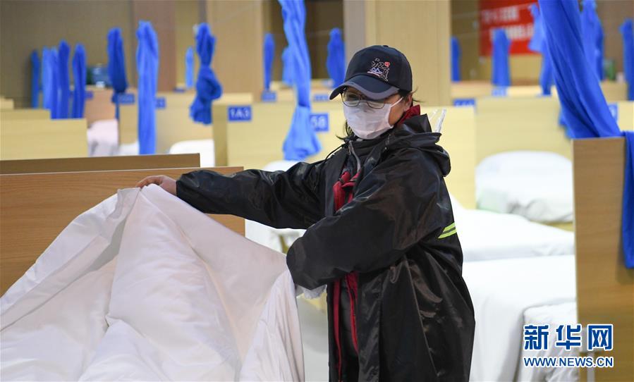 2月14日上午,武汉首个以中医为主的方舱医院开舱,预计当日迎接患者。 江夏方舱医院位于湖北省武汉市的江夏大花山户外运动中心,江夏方舱医院现有5个病区,约400张床位。 新华社记者 程敏 摄