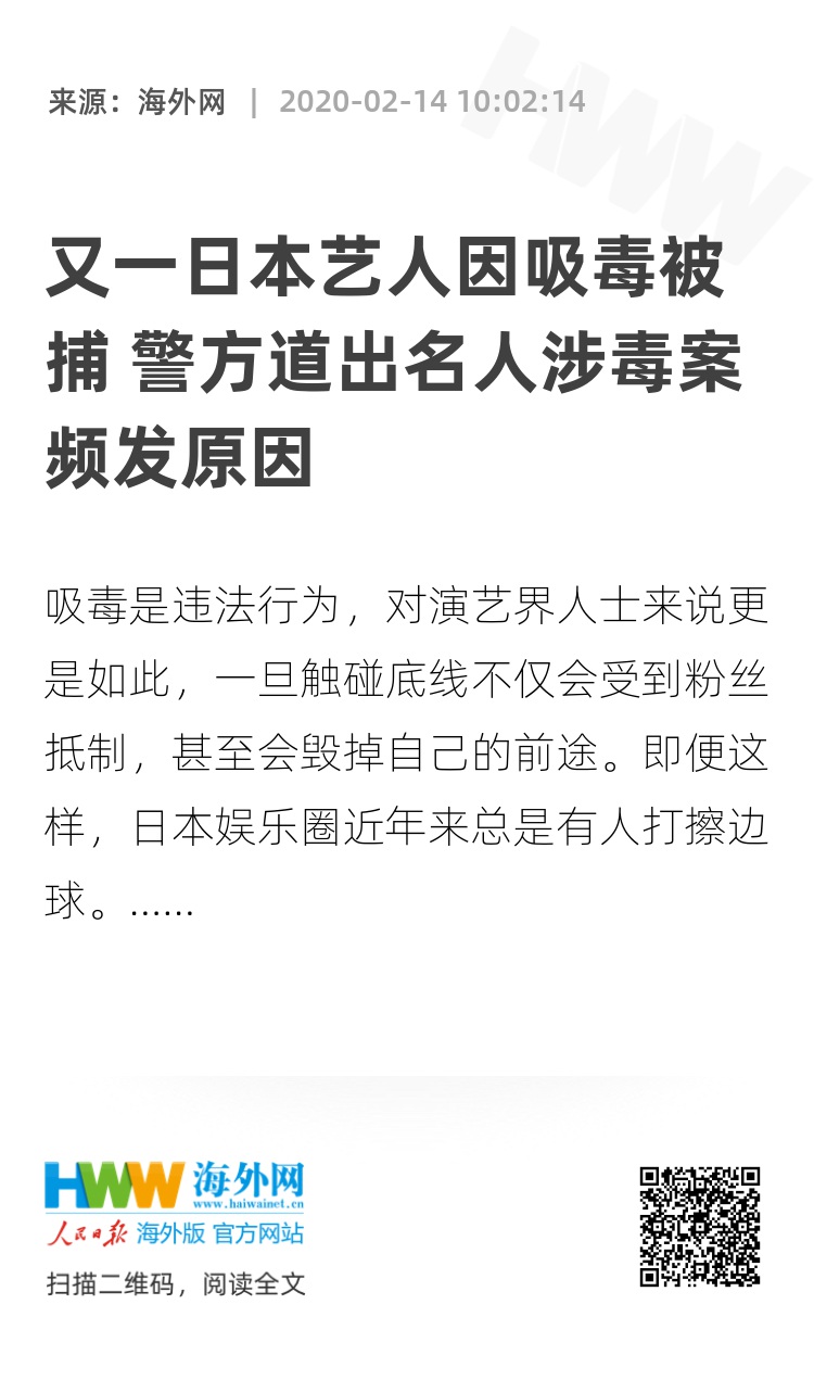 为何日本艺人频频因涉毒被捕?日本警方一位搜查人士给出了回答:“演艺界人士有钱,他们是毒品卖家的‘座上宾’。他们也很在意被查处,总是在通过很少的接触(毒品卖家)机会,一次购入大量毒品。这对卖家来说很好赚钱,因此将演艺界人士定为目标。”(海外网 王珊宁)