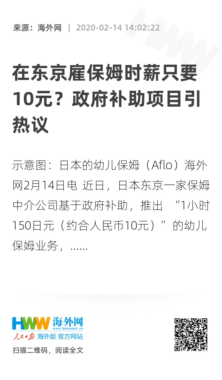 海外网2月14日电 近日,日本东京一家保姆中介公司基于政府补助,推出 “1小时150日元(约合人民币10元)”的幼儿保姆业务,在日本引发广泛关注。但很快该业务就被指存在陷阱,会让客户额外纳税。