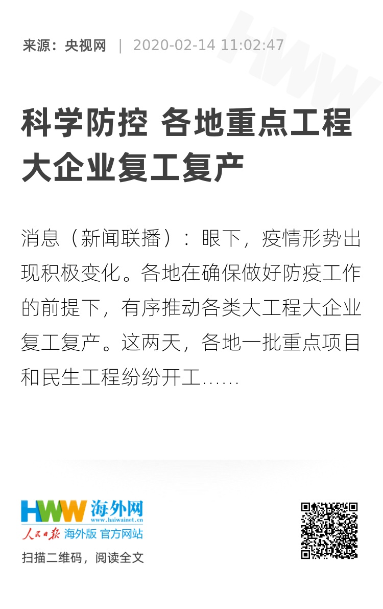 31717804,.科学防控 各地重点工程大企业复工复产,.2020-02-14 11:32:47,.204306,.秦雅楠