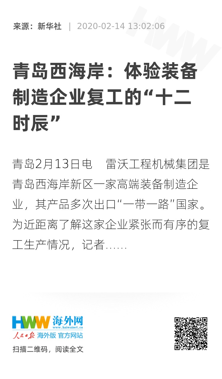 新华社青岛2月13日电 雷沃工程机械集团是青岛西海岸新区一家高端装备制造企业,其产品多次出口“一带一路”国家。为近距离了解这家企业紧张而有序的复工生产情况,记者复工第二天获准走进了这家企业。