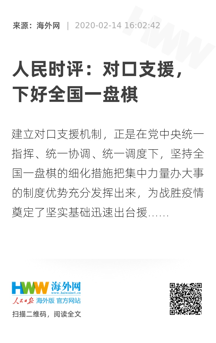 对口支援机制公布之后,网友在社交媒体上纷纷留下暖心话语,为制度优势点赞,为疫情防控加油。疫情发生以来,广大党员、干部、群众积极响应党中央号召,坚定信心、顾全大局、自觉行动、顽强斗争,以行动践行了“人心齐,泰山移”的哲理。在这场必胜的战斗中,凝聚更大力量、付出更坚实努力,胜利一定不会遥远。(桂从路)