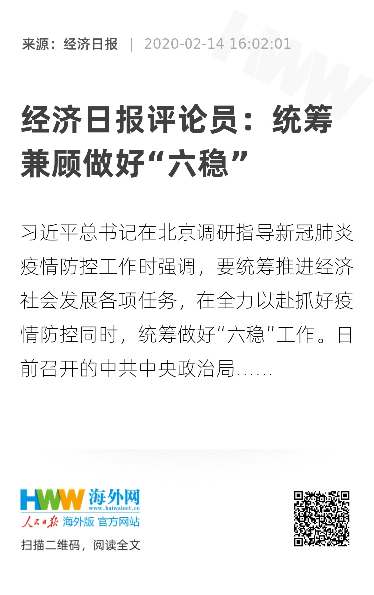 习近平总书记在北京调研指导新冠肺炎疫情防控工作时强调,要统筹推进经济社会发展各项任务,在全力以赴抓好疫情防控同时,统筹做好“六稳”工作。日前召开的中共中央政治局常务委员会会议也强调,各级党委和政府要努力把新冠肺炎疫情影响降到最低,保持经济平稳运行和社会和谐稳定,努力实现党中央确定的各项目标任务。