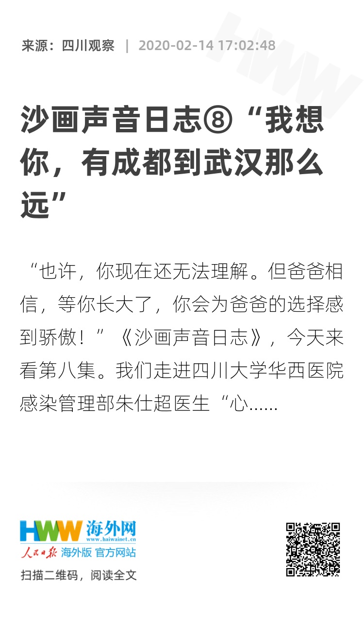 我们华西医院呼吸科的护士老师谢莉,她8岁的女儿在她上班时,多次跟她尝试视频通话无果后,给她发来了这样一句话,“妈妈,我想你,有成都到武汉那么远。”她听了潸然泪下。