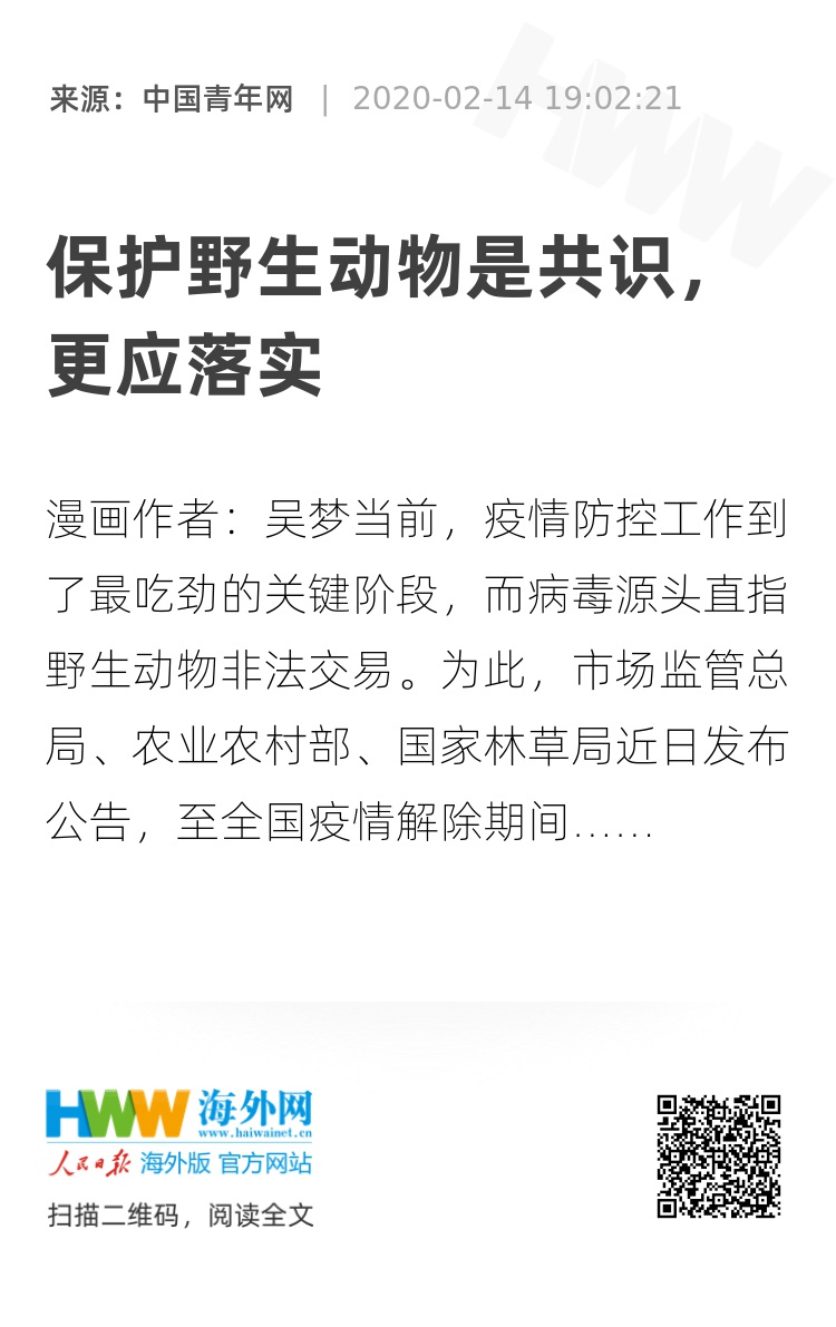 正如不少网友所言:“舌尖上的肺炎”让人们再次明白保护野生动物的重要性。的确,从2003年的“非典”到此次的新冠肺炎疫情,代价是巨大的,教训更是惨痛的,保护野生动物不能仅仅停留于嘴上、纸上,更应该好好落实在我们的行动上。