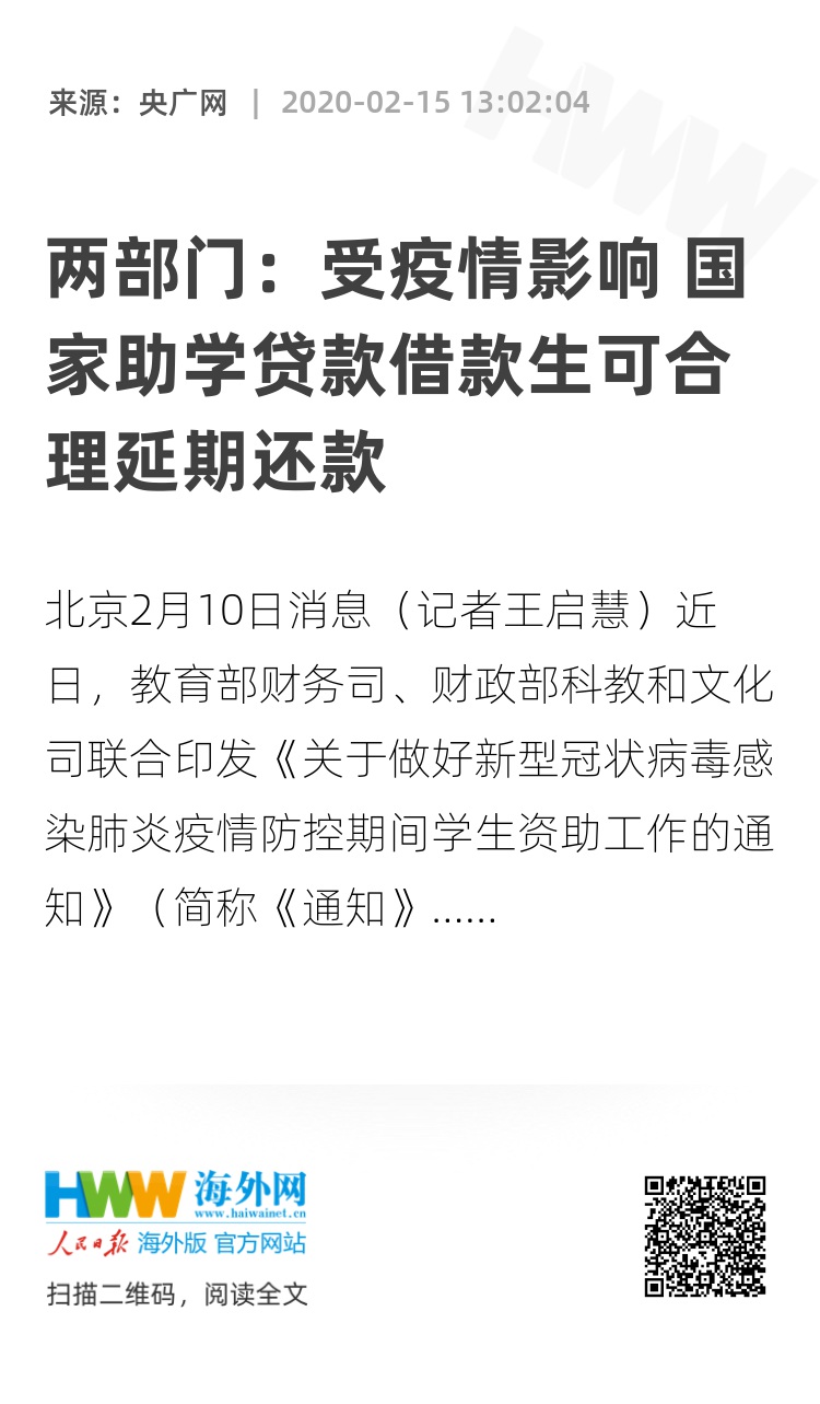 央广网北京2月10日消息(记者王启慧)近日,教育部财务司、财政部科教和文化司联合印发《关于做好新型冠状病毒感染肺炎疫情防控期间学生资助工作的通知》(简称《通知》)。《通知》明确了对受疫情影响的家庭困难学生的资助办法,同时提出,国家助学贷款借款生可合理延期还款。