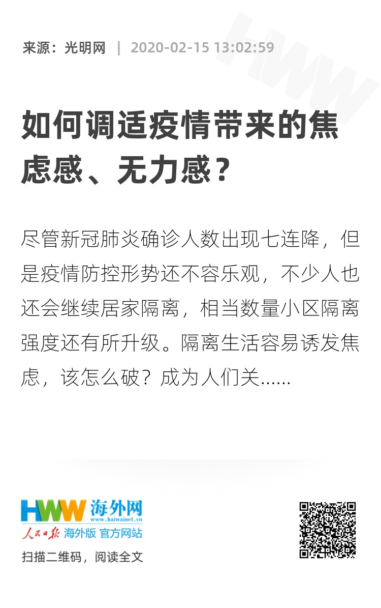 隔离状态下单独面对新冠肺炎,极易形成焦虑甚至过度的状态,许多人往往感受到极度的无能为力和无所作为。焦虑的一个主要功能是为将来做准备,而在当下情景中,我们彷佛无法做些什么来改善境况,焦虑难免会增加。