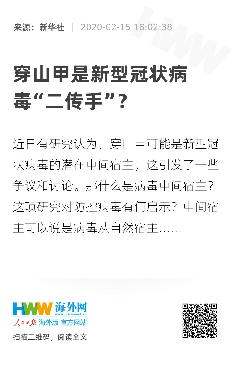 美国斯克里普斯研究所免疫学家和计算生物学家克里斯蒂安·安德森表示,他比较了已公开的穿山甲携带病毒的基因序列,发现其与新型冠状病毒基因序列相似,期待更多的相关数据。