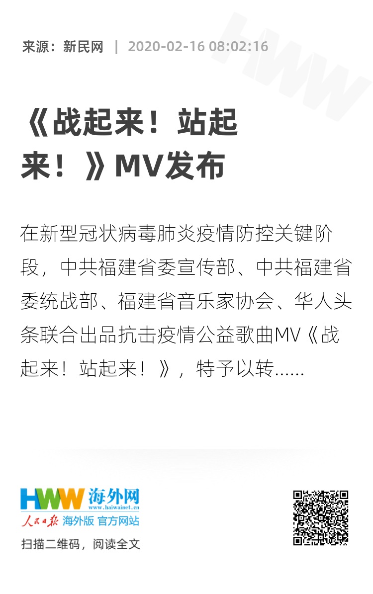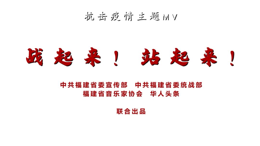 在新型冠状病毒肺炎疫情防控关键阶段,中共福建省委宣传部、中共福建省委统战部、福建省音乐家协会、华人头条联合出品抗击疫情公益歌曲MV《战起来!站起来!》,特予以转发,让我们一起贡献力量、聚力战“疫”!