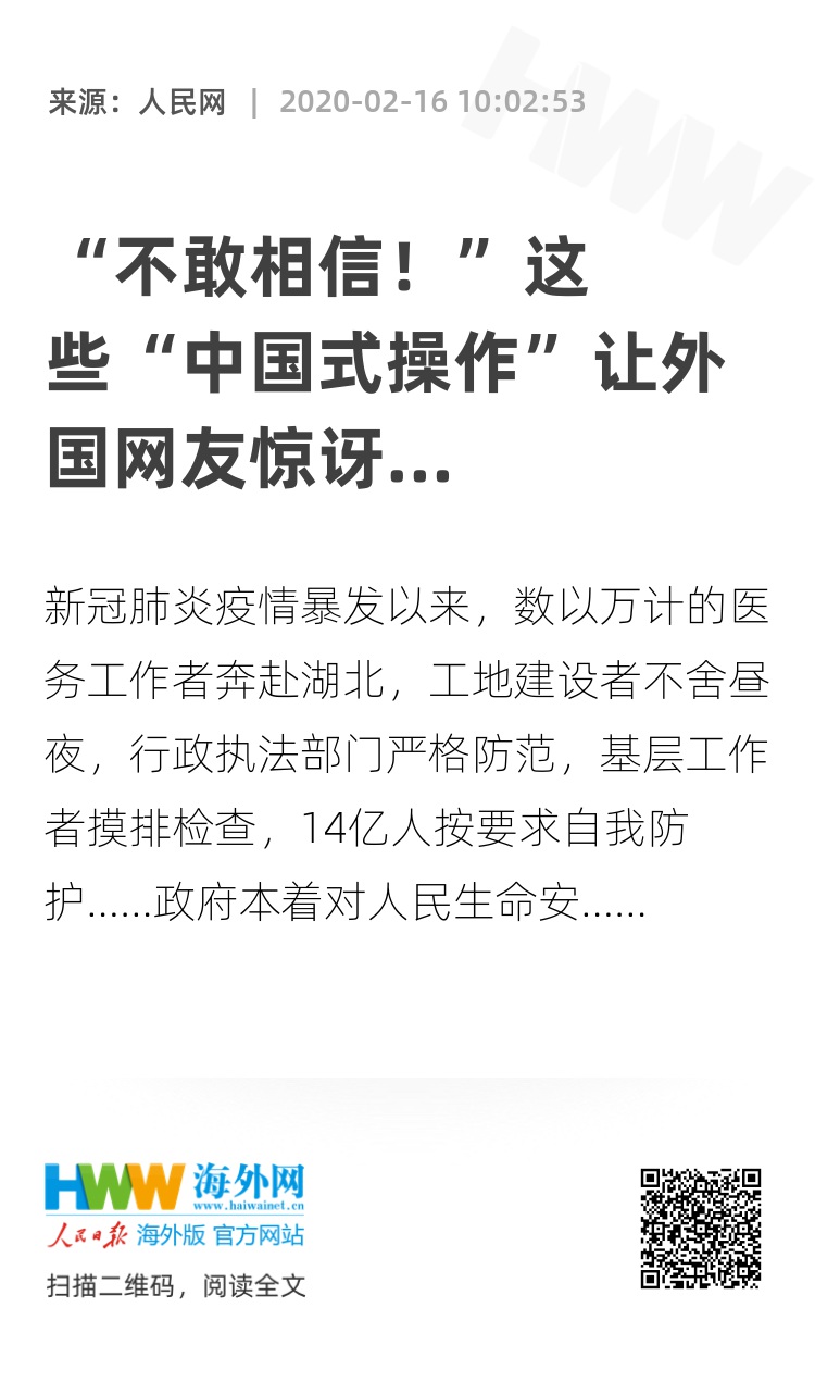 新冠肺炎疫情暴发以来,数以万计的医务工作者奔赴湖北,工地建设者不舍昼夜,行政执法部门严格防范,基层工作者摸排检查,14亿人按要求自我防护……政府本着对人民生命安全和身体健康高度负责的态度,采取了前所未有的防控与救治措施,誓言坚决打赢疫情阻击战。境内外网民纷纷点赞“中国组织力”,高度评价我集中力量办大事的制度优势、把百姓健康安危放首位的执政理念、全民齐心群防群控的团结精神。“只有中国可以”成为海内外社交平台的超高频留言。
