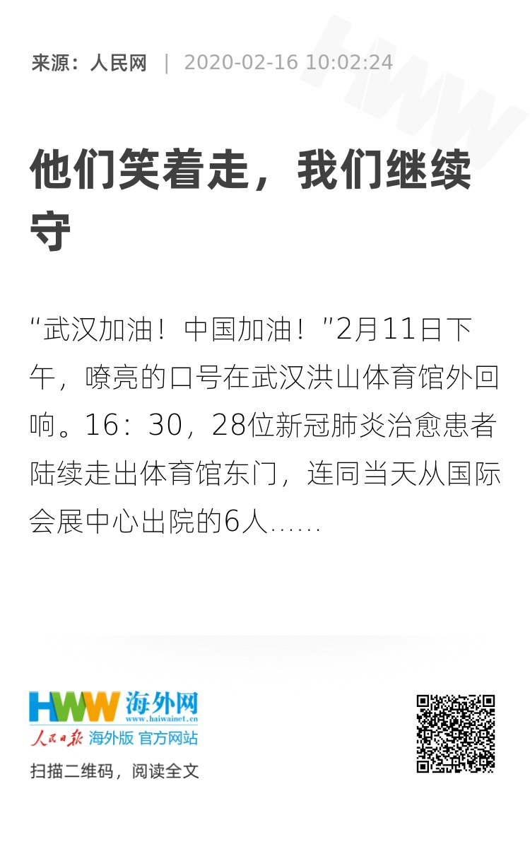 16:30,28位新冠肺炎治愈患者陆续走出体育馆东门,连同当天从国际会展中心出院的6人,首批从江汉、武昌“方舱医院”出院患者共34人。笑容在他们脸上漾开,连同合影时的欢呼,传递着喜悦与信心。