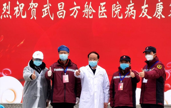 武昌“方舱医院”院长和医生为出院患者点赞。人民网湖北频道张婵 摄