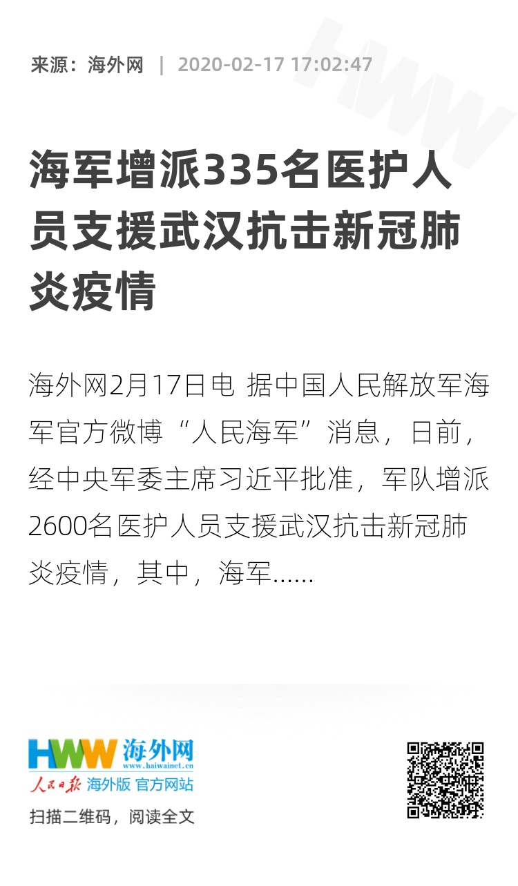 海外网2月17日电 据中国人民解放军海军官方微博“人民海军”消息,日前,经中央军委主席习近平批准,军队增派2600名医护人员支援武汉抗击新冠肺炎疫情,其中,海军从各战区海军和军医大学抽组335名医护人员奔赴武汉。