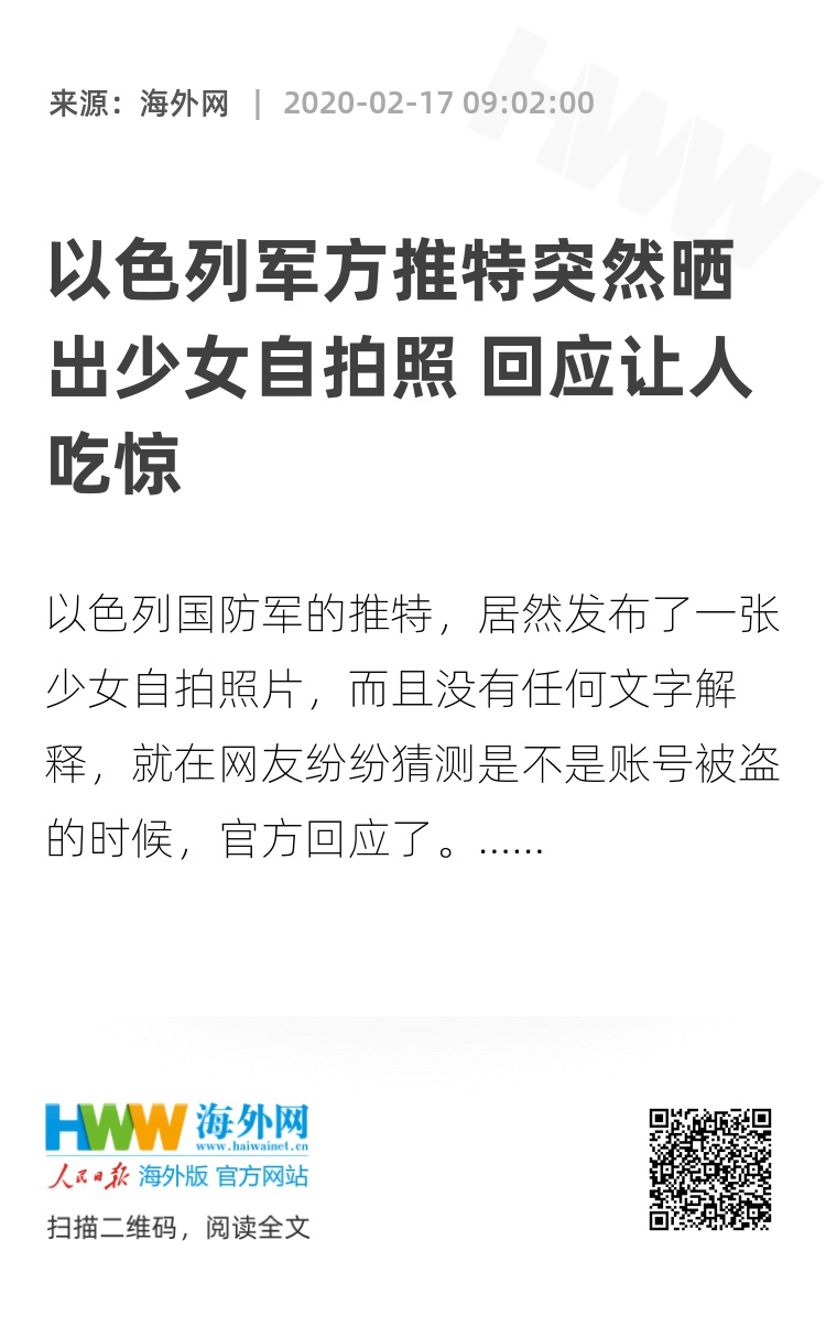 海外网2月17日电 当地时间16日下午,以色列国防军推特账号突然晒出一张少女自拍照,引不少网友猜测,账号是被盗了吗?半小时后,该推特却解释说,这是哈马斯冒充美女勾引以色列士兵使用的照片。