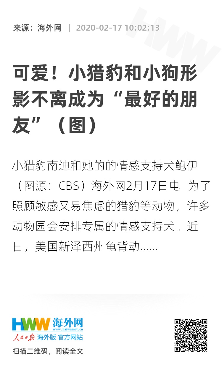 据悉,目前非洲野外仅存7000只猎豹,这对“最好的朋友”参加的教育活动鼓励游客们保护大型猫科动物。(海外网/爱扎大 实习编译/张海桐)