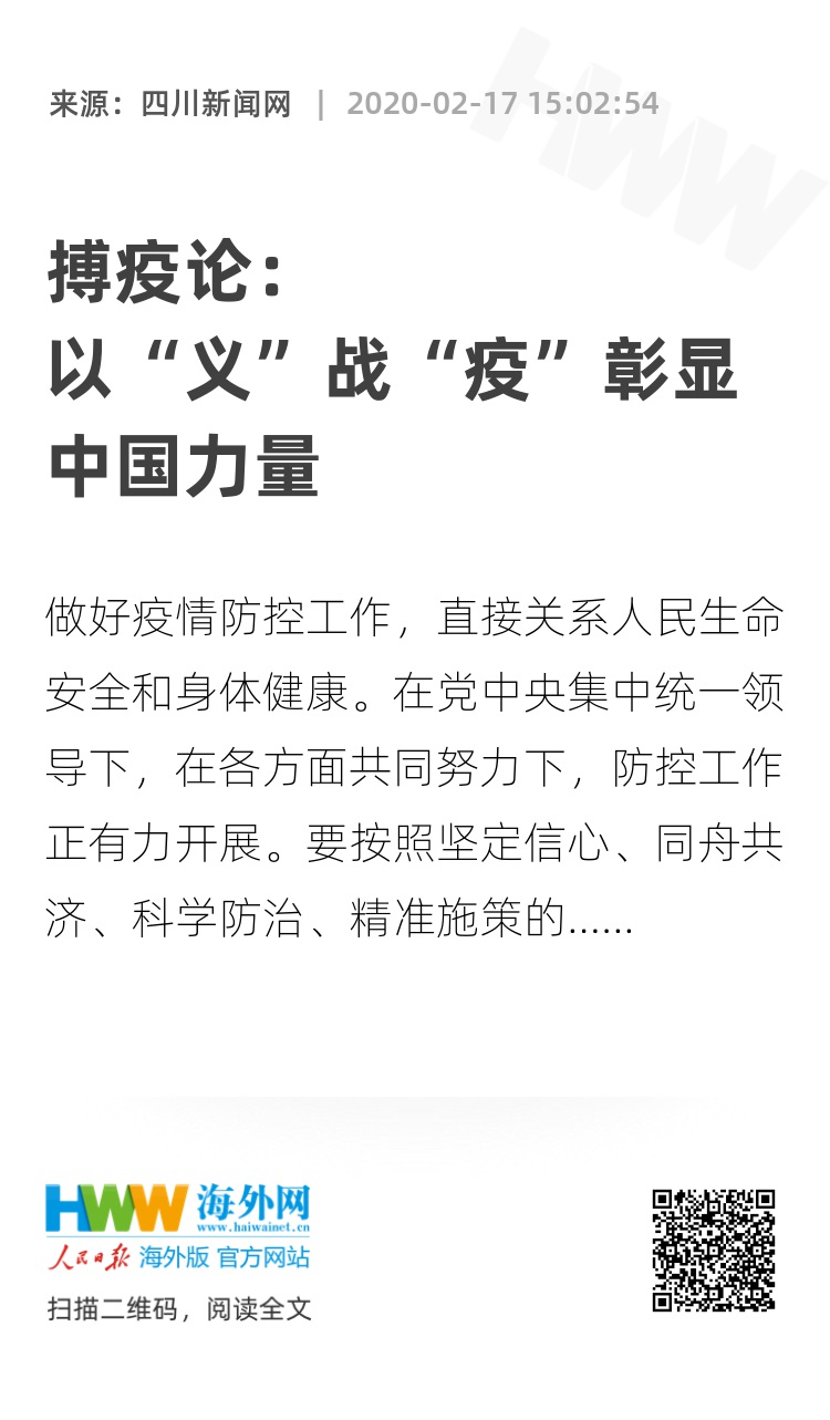 中国在疫情防控中的举措,得到了世界称赞“中方的努力有效防止了疫情向其他国家蔓延”。全国医护人员驰援武汉,运-20首次执行非战争军事任务支援湖北医疗队队员和物资,“火神山”“雷神山”医院十天建成,全世界都见证了“中国力量”“中国速度”,其背后并没有什么“秘密武器”,有的不过是一个“义”字。