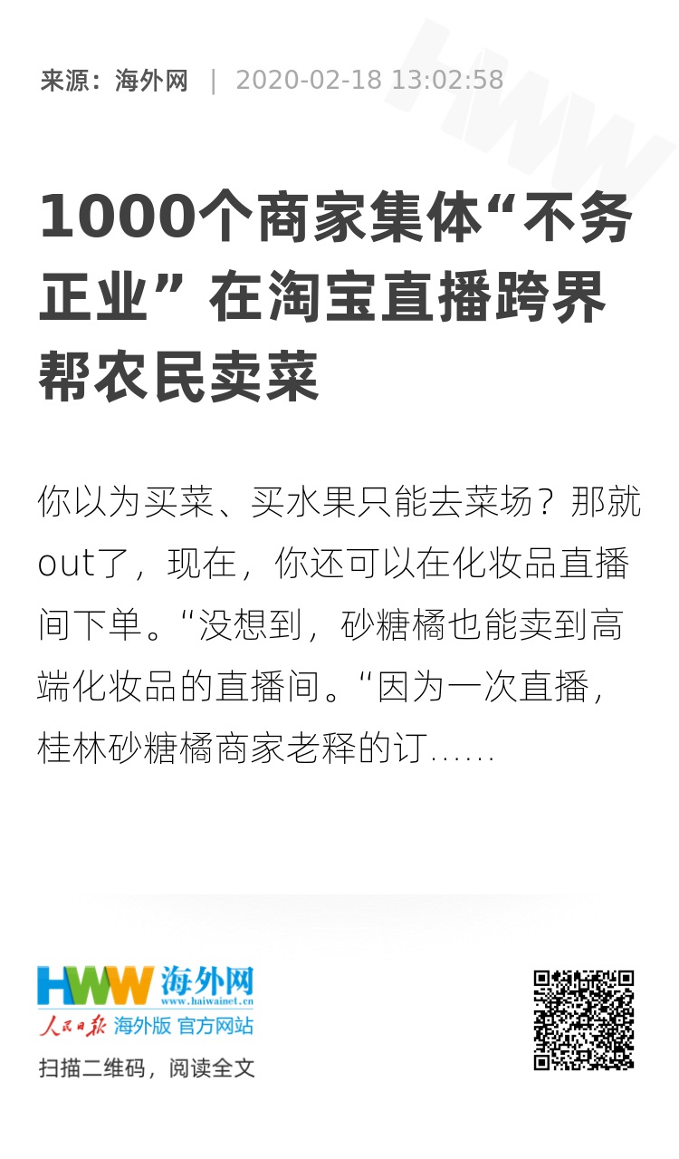 最近,淘宝直播上,1000多个商家发起了一场“不务正业”的跨界卖菜:不管自己是卖衣服还是化妆品,都帮农民卖起了水果蔬菜。他们有的在直播间挂上农产品链接,有的在直播中连麦村播主播,双方现场PK。联合利华、李宁、海信、娇韵诗、森马、一叶子等14个品牌,还开启了一对一帮扶农产地,用直播为当地的特色农产品带货。