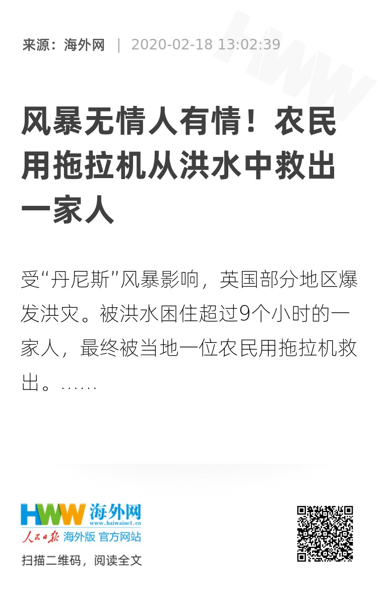 据悉,这名农民约翰·杨(John Young)几次试图用拖拉机帮助他们,但水位太高了,没有办法够得着。当地时间17日下午4点30分,约翰终于设法找到了他们,并带到安全的区域。