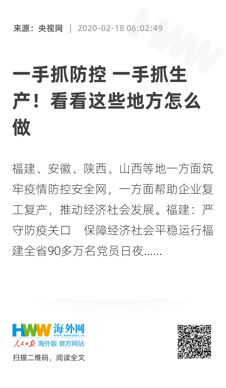 福建、安徽、陕西、山西等地一方面筑牢疫情防控安全网,一方面帮助企业复工复产,推动经济社会发展。