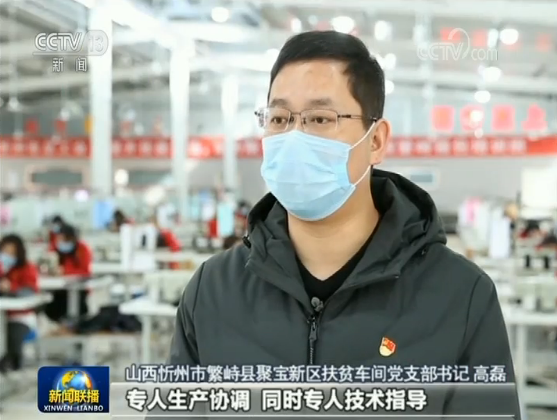 山西省忻州市繁峙县聚宝新区扶贫车间党支部书记 高磊:专人生产协调,专人技术指导,专人后勤保障,在疫情防控的关键期咱一样要让大家搬得出,稳得住,能致富。