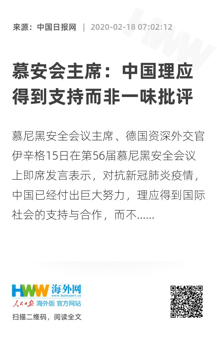 慕尼黑安全会议主席、德国资深外交官伊辛格15日在第56届慕尼黑安全会议上即席发言表示,对抗新冠肺炎疫情,中国已经付出巨大努力,理应得到国际社会的支持与合作,而不是一味批评。(视频 欧阳雪妍)