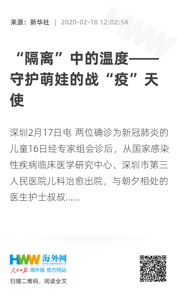 新华社深圳2月17日电 两位确诊为新冠肺炎的儿童16日经专家组会诊后,从国家感染性疾病临床医学研究中心、深圳市第三人民医院儿科治愈出院,与朝夕相处的医生护士叔叔阿姨们深情拥抱。