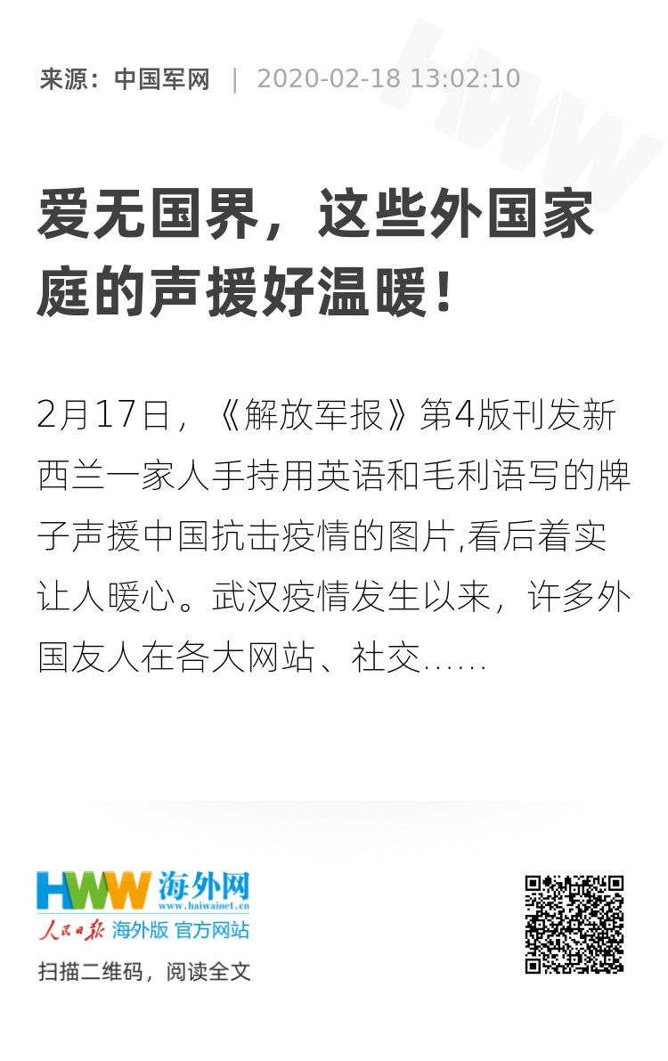 2月17日,《解放军报》第4版刊发新西兰一家人手持用英语和毛利语写的牌子声援中国抗击疫情的图片,看后着实让人暖心。武汉疫情发生以来,许多外国友人在各大网站、社交媒体上为正在全力抗“疫”的中国鼓劲加油。中国军网从中挑选出一部分外国友人携家人一起为武汉加油、为中国鼓劲的图片,有没有哪张暖到你?