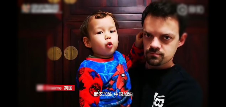 2月8日,英国小哥格雷姆和他的孩子用中文齐声喊“武汉加油、中国加油”。
