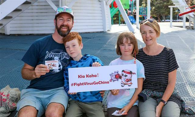 2月15日,在新西兰首都惠灵顿东方湾海滨,一家人手持用英语和毛利语写的“抗击疫情!中国加油!”字样的牌子,声援中国抗击疫情。 孟韬摄