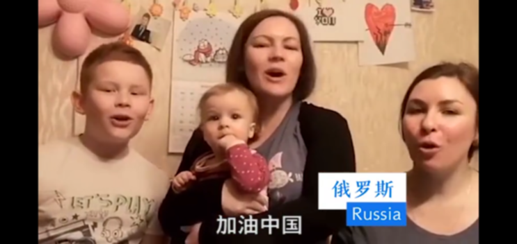 2月7日,一位俄罗斯妈妈和她的家人一起为中国加油。