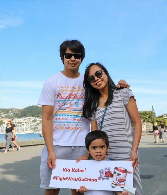 2月15日,新西兰的一家三口手持用英语和毛利语写的“抗击疫情!中国加油!”字样的牌子,声援中国抗击疫情。涂毅 摄