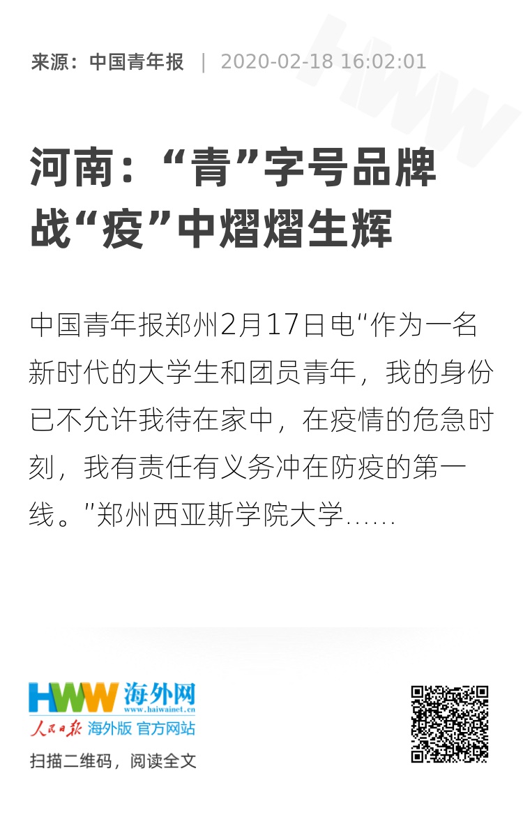 面向社会青年,河南团组织推出《习近平对疫情防控作最新指示!》《别信!这些都是谣言》《河南省人大出台办法为依法战“疫”提供保障!》《驰援鄂豫抗击疫情,河南青年在行动》等文章,传播党的声音,及时发布疫情权威信息和辟谣回应,全面展示团员青年的战“疫”风采。