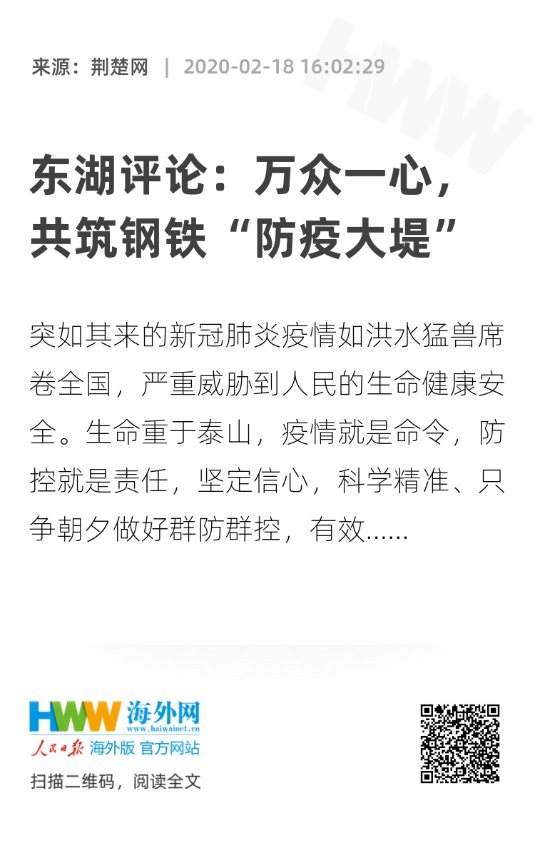 突如其来的新冠肺炎疫情如洪水猛兽席卷全国,严重威胁到人民的生命健康安全。生命重于泰山,疫情就是命令,防控就是责任,坚定信心,科学精准、只争朝夕做好群防群控,有效遏制病毒的扩散,发动全社会的力量共筑起铁一般的“防疫大堤”,让疫情可控、可治,是当前我们必须面对、克服的燃眉之急。